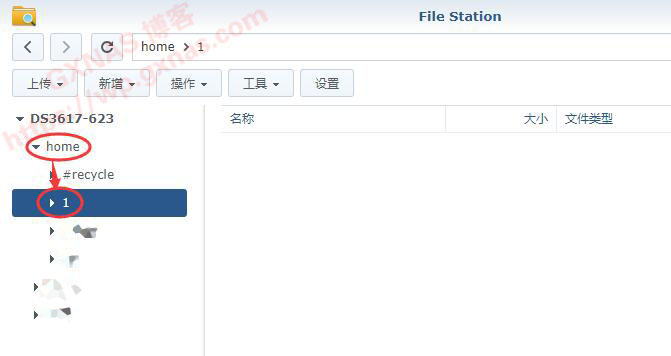 6、打开群晖File Station,在非中文的共享文件夹建立一个子文件夹(我选择在home里面建立1这个子文件夹);