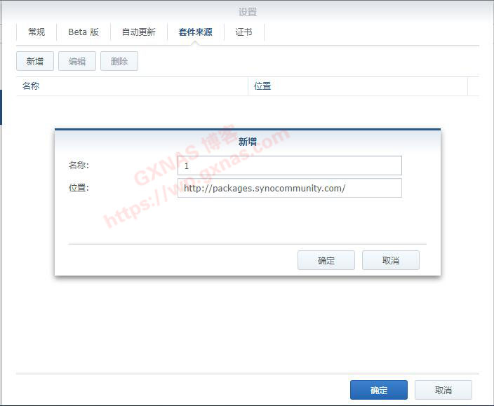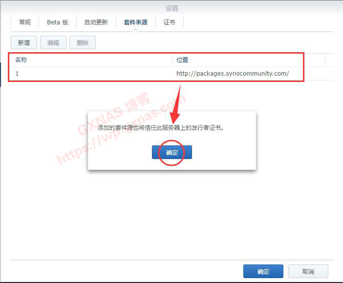 18、再回到群晖的套件中心,在套件中心-设置-来源,新增,加入第三方套件的地址,确定;
