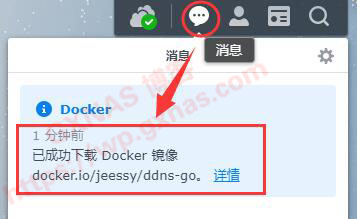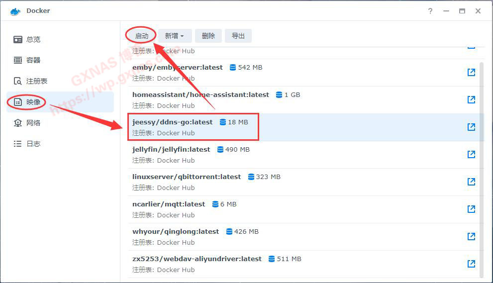7、在Docker的映像,找到下载好的“jeessy/ddns-go”,选中,启动;