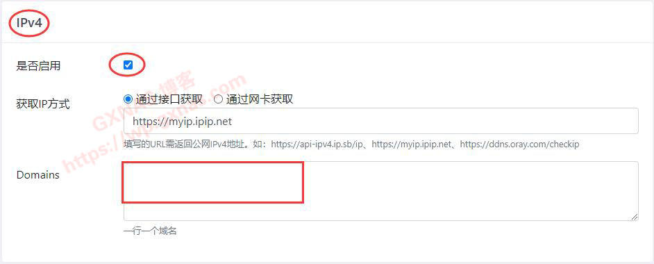 18、如果需要使用IPv4做DDNS的,在“ipv4”的“是否启用”处打勾(群晖连接的宽带需要有公网IPv4),同时在“Domains”处填写需要解析的域名(格式:abc.com或者www.abc.com,不要加http://或者https://等前缀);