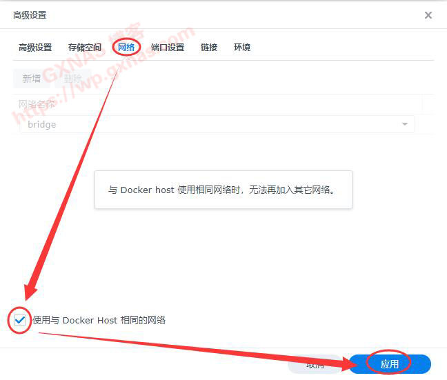 13、在“网络”的下方,“使用与Docker Host相同的网络”打勾,应用;