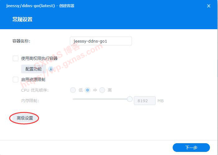8、如果你的群晖系统版本是DSM7.0.1-42218及以下的版本,在弹出的界面中,点“高级设置”;