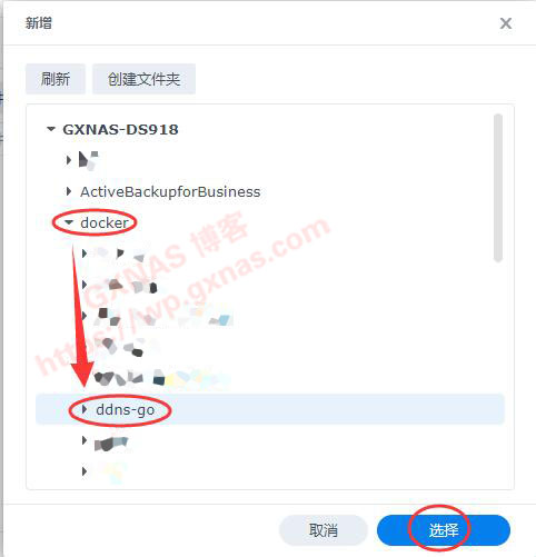 8、找到在本教程【操作流程】的第1步骤建立的文件夹”ddns-go“,点击该文件夹,再点”选择“;