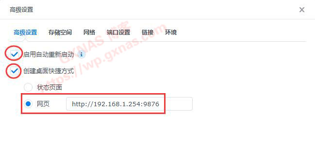 9、在“启用自动重新启动”和“创建桌面快捷方式”打勾,选“网页”,并且在“网页”显示的群晖IP右边加上“:9876”(注意:此链接要用http开头,不能是https开头);