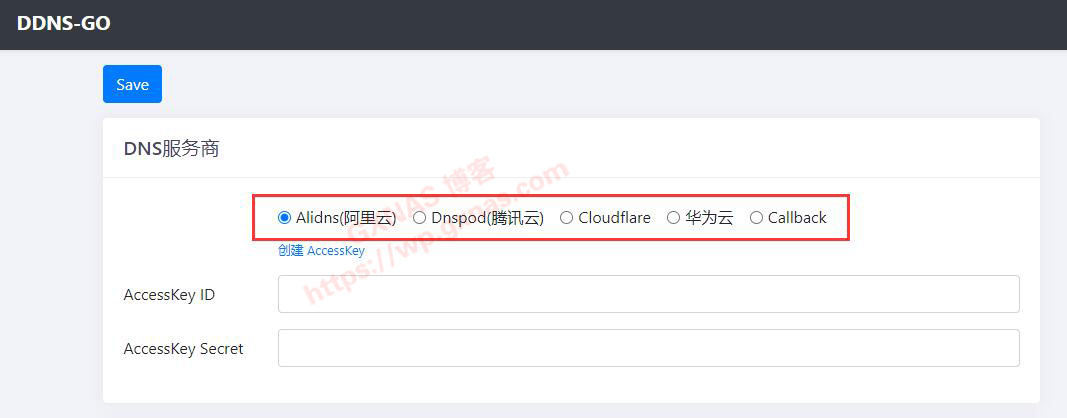 4、切换到群晖的DDNS-GO界面,在“DNS服务商”选择“Alidns(阿里云)”,并且把在上一步骤获取到的“AccessKey ID”和“Secret ID”两个参数填写进来;