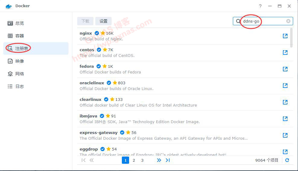 3、打开Docker,在注册表输入“ddns-go”,搜索;