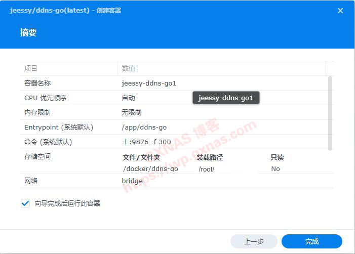 15、勾选“向导完成后运行此容器”,然后点“完成”;