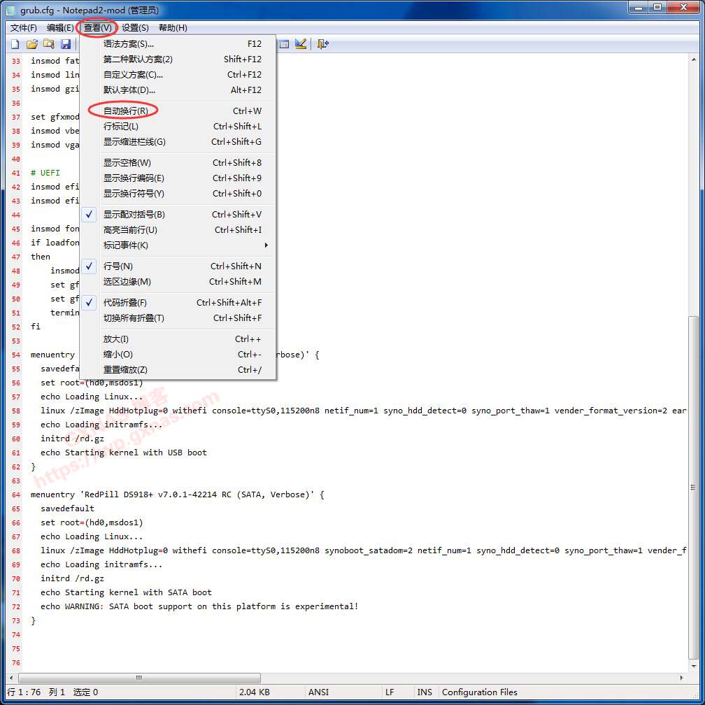 8、用Notepad2打开grub.cfg文件,在菜单上的“查看”,找到自动换行,点一下;