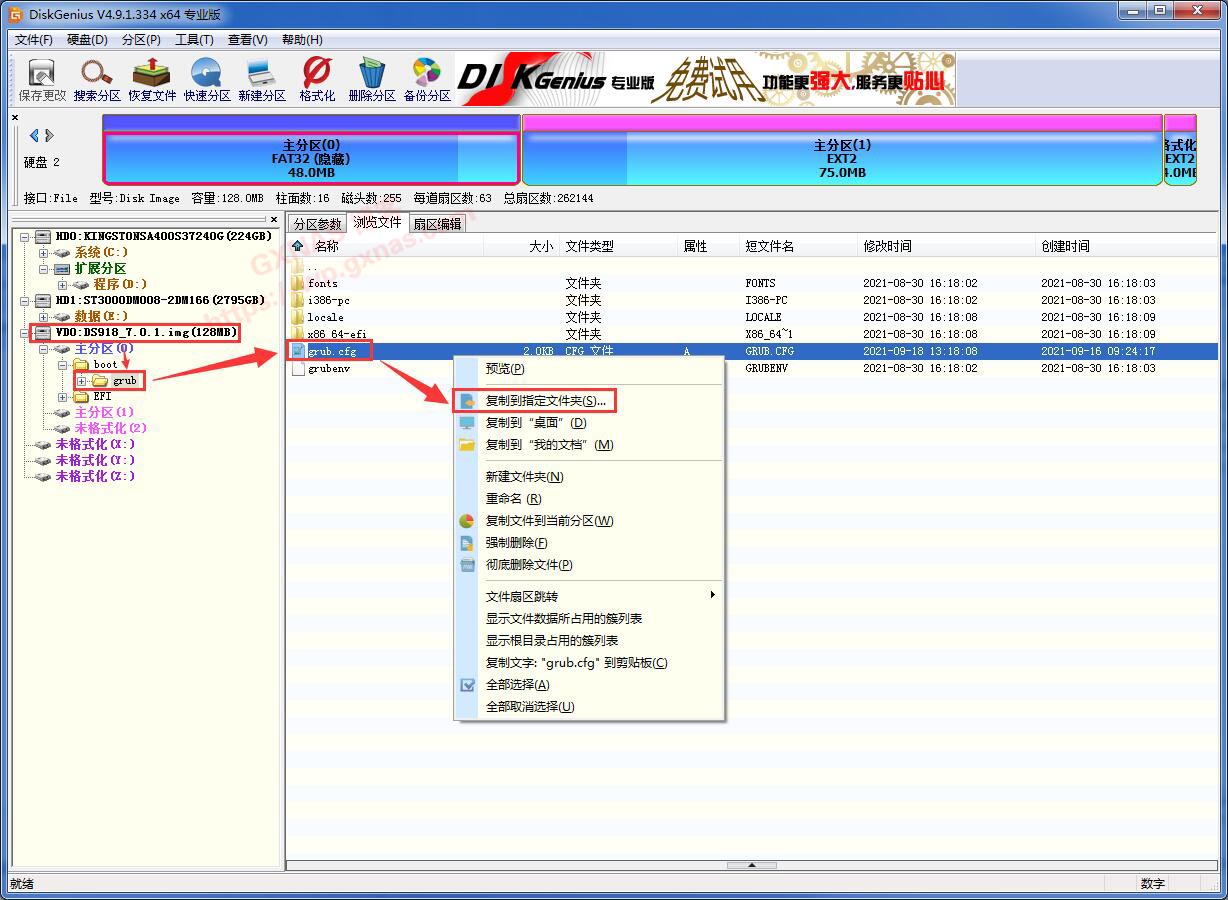 5、在左边栏中点+,点grub文件夹,在右边找到grub.cfg文件,在此文件上点鼠标右键,弹出的菜单中选择“复制到指定的文件夹”;