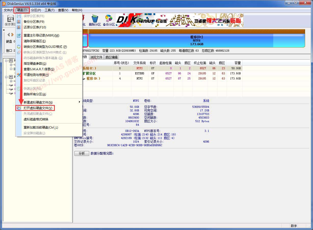 3、打开DiskGenius软件,点菜单上的“硬盘”—“打开虚拟硬盘文件”;