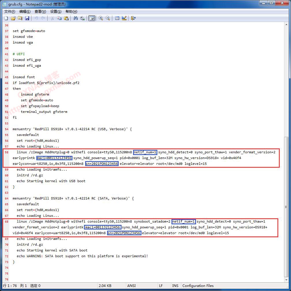 9、向下翻页到第58行和第68行,先找到下图圈出蓝色字,根据实际情况修改(58行和68行都要改),改好了就保存文件,关闭Notepad2;