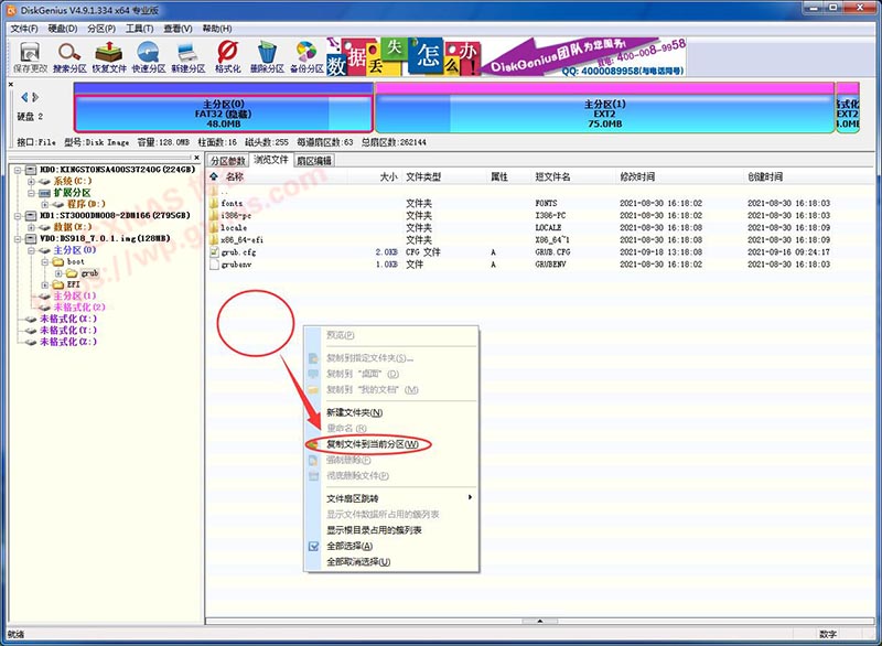 10、切换到DiskGenius软件,在右边空白处点右键,在弹出的菜单选择“复制文件到当前分区”;
