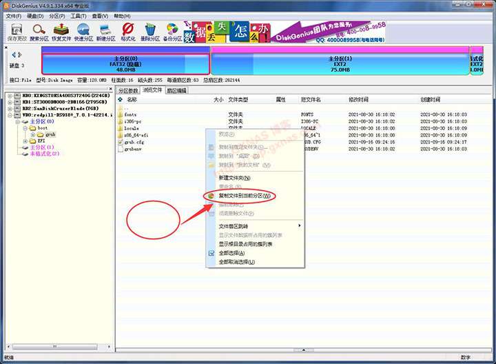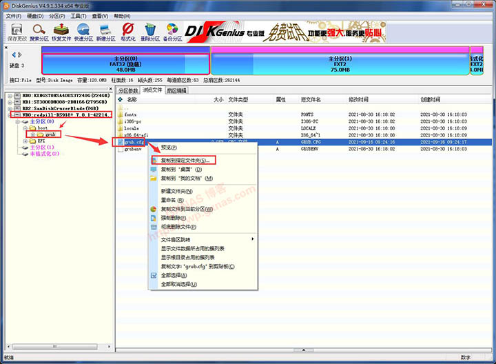 14、切换到刚才打开的DiskGenius,在右边grub.cfg的空白区域点鼠标右键,复制文件到当前分区。