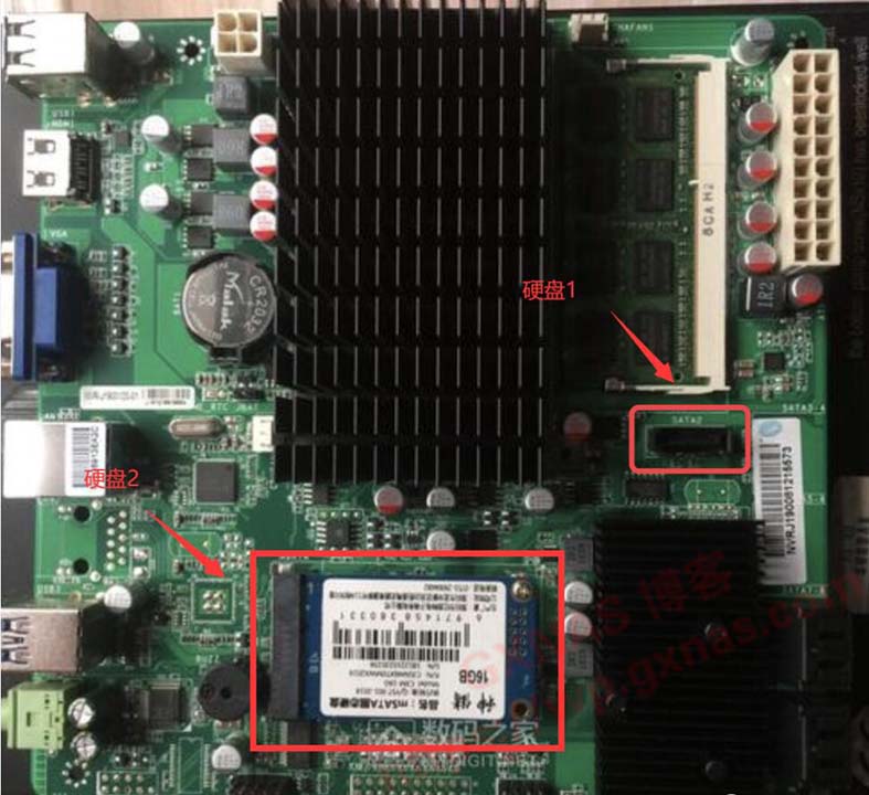 1、由于蜗牛星际这个机器的SATA接口比较奇特,所以在安装群晖系统之前,需要先一下准备工作:就是需要拆开机箱,在下图硬盘1的SATA口,需要接上硬盘,硬盘的电源从蜗牛主机背板电源口用大4pin一分二的线转接出来,再接一个大4pin转SATA的线,安装好群晖系统以后,这个硬盘还要一直接着,不可以拆走。