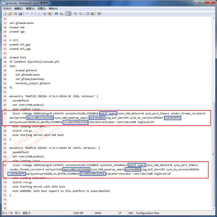 9、用Notepad2.exe打开grub.cfg,向下翻找到第58行和第68行,先找到图上圈出蓝色字,下面根据实际情况修改(VID和PID,原有的0x不可以删除哦)。