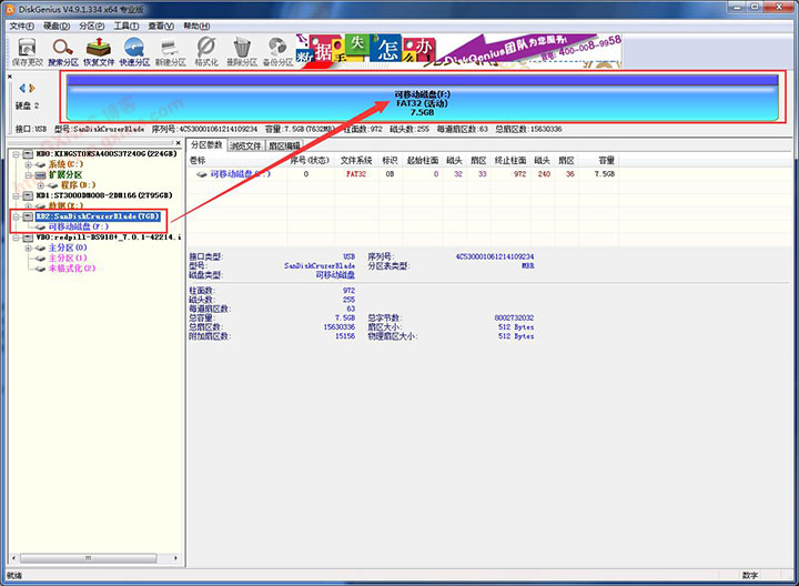 18、在DiskGenius左边栏找到U盘,确认一下整个U盘全部分成了一个分区(如果U盘有多个分区的,需要删除所有的分区,再重新建立一个新的分区,并格式化成NTFS或者FAT32格式)。