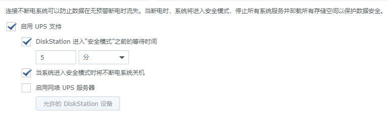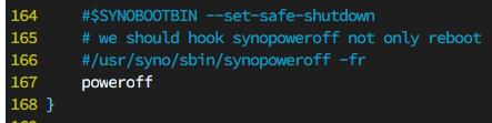 由于群晖系统连接的 UPS ,默认是是市电断电后进入“安全模式”,硬盘挂起并不会自动关机,如果 UPS 的功率太低的话,UPS 电池耗尽,UPS 就会给群晖“强制”断电,造成群晖再开机时会显示非法关机。这样的关机方式对硬盘是有损坏的,所以想实现当市电断电的时候,让群晖“正常”的关机。此时,需要先在“群晖控制面板”—“终端机和SNMP”—“启用SSH功能”上打勾,启用SSH功能,然后在Windows电脑上,使用SSH软件以root用户登录群晖,修改 /usr/syno/bin/synoups 文件,DSM6.X的版本找第 166 行的“/usr/syno/sbin/synopoweroff -fr”(DSM7.X的系统找第171行的内容“/usr/syno/sbin/synopoweroff -s &”):