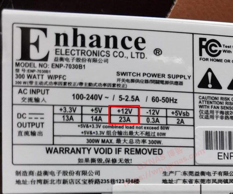 2、在+12V这里显示是23A,粗略计算,这个300W电源最多可以带7个机械硬盘;