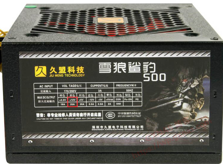 4、在+12V这里显示是20A,粗略计算,这个500W电源最多可以带6个机械硬盘;