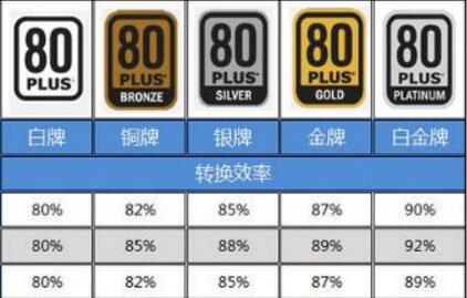 2、复杂一点讲,电源分为有80Plus认证和没有80Plus认证的普通电源。80Plus认证是美国能源署制订的一个标准,分别有:白牌、铜牌、银牌、金牌、白金牌等几种,效率至少是80%的,好的电源效率会高达90%以上。而非80Plus认证的效率在75%左右,有些偷工减料的电源,效率甚至低于70%(相当于你交的10元电费里有3元被浪费掉了)。