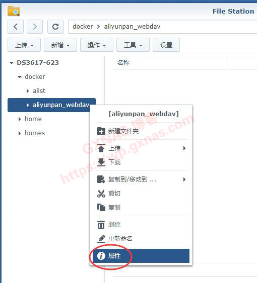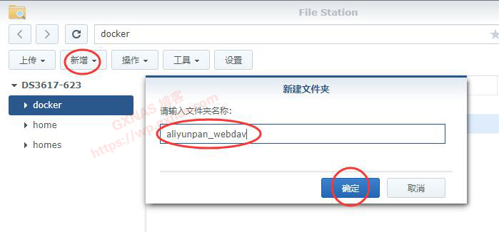 二、打开群晖的File Station,在docker共享文件夹下建立一个文件夹,名字可以随便起,我这写的名字是:aliyunpan_webdav;