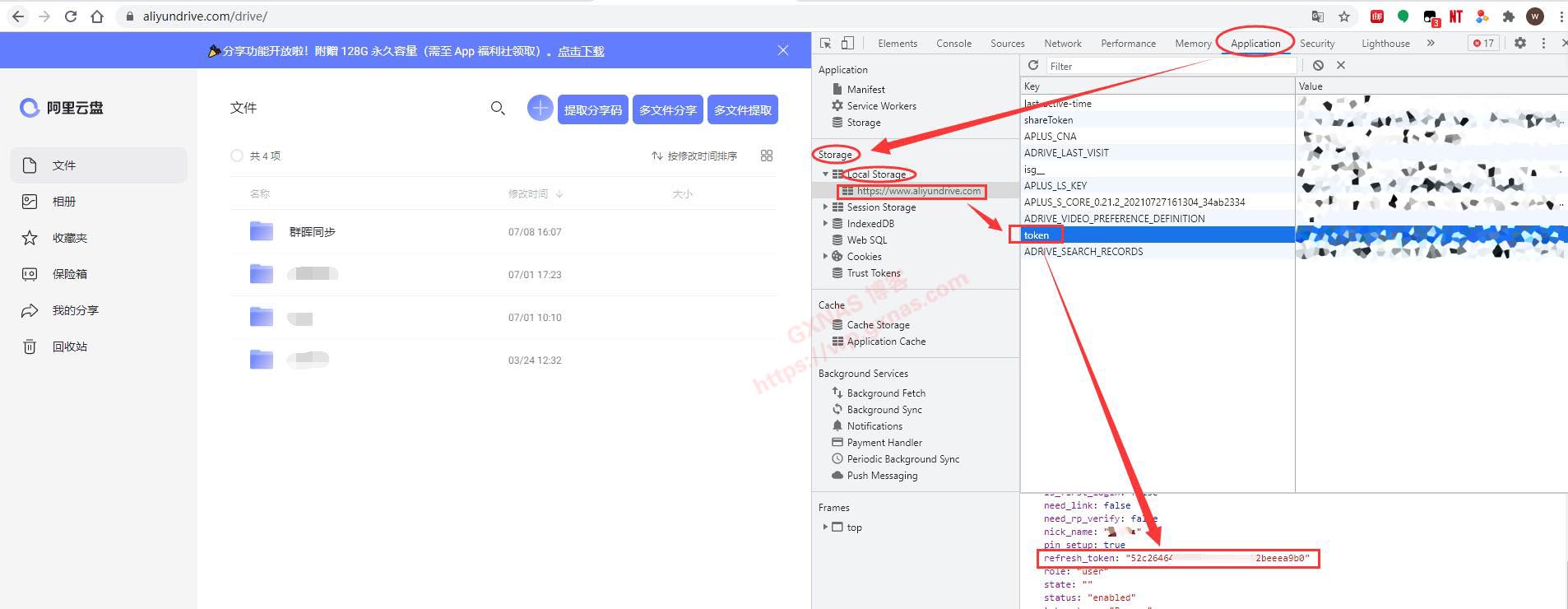 六、登录到阿里云盘首页后,在浏览器的窗口按F12 键进入开发者模式,找到 Application 标签点它,在Storage菜单下找到Local Storage的下面,点https://www.aliyundrive.com这一行,在右边菜单找到 token 点它,在下方找到 refresh_token ,把引号里面的内容复制出来,等下需要用到;