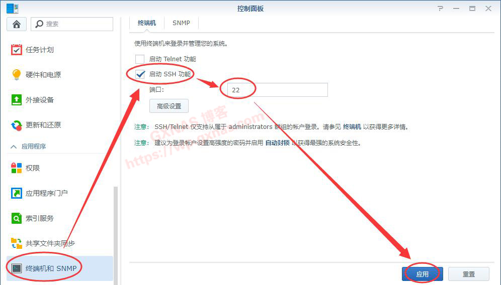 七、在群晖控制面板,终端机和SNMP,把“启动SSH功能”打勾,并设置一个端口(我这里就用默认的22端口,如果需要映射到公网的,建议把默认的22改成别的数字);