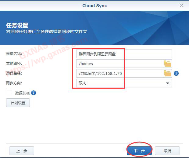 二十、设置好需要同步的群晖本地文件夹、阿里云盘上的远程文件夹和同步方向(可以设置成双向同步、群晖只上传阿里云盘、阿里云盘只下载到群晖),下一步;