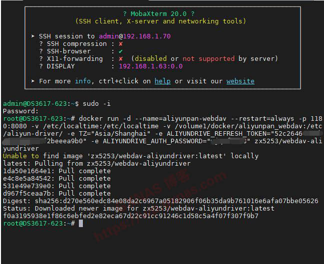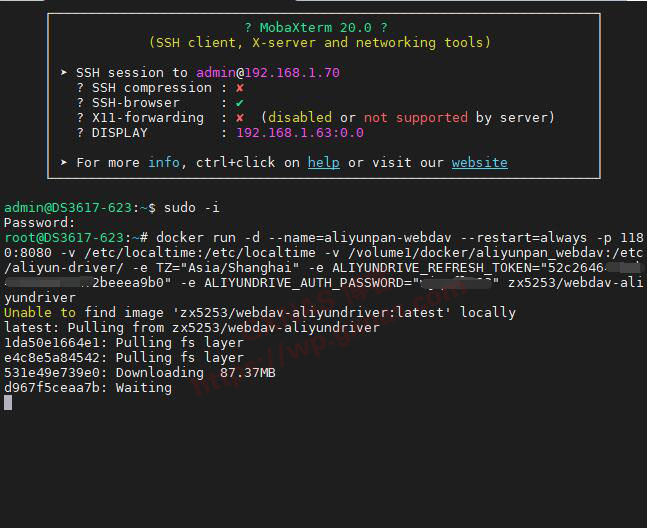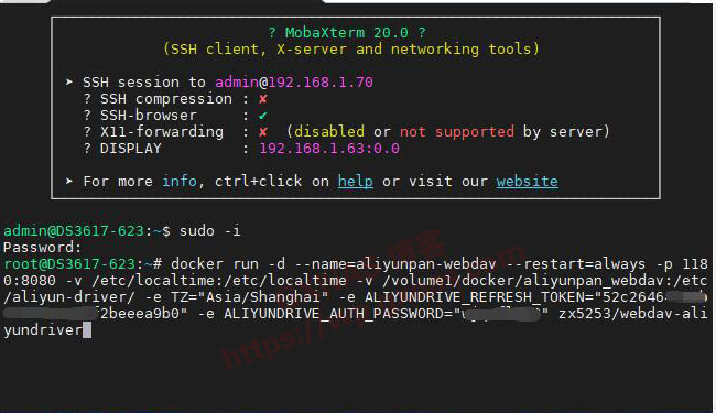 十一、复制以下命令,并按照你的实际情况修改(其中:1180是访问端口,“阿里云盘的token”在上面第六步获取到;“访问密码”需要自己设置一个,建议用和群晖一样的密码,方便记忆,但是不要用类似123456这种弱口令;/volume1/docker/aliyunpan_webdav/是第四步骤复制的路径;),改好以后全选复制到SSH工具的界面按下 Shift + Insert 粘贴后回车(2022年7月29日更新:由于原作者zx5253删库跑路,以下脚本于已失效,具体请在docker搜索aliyundrive,然后查看作者写的说明):