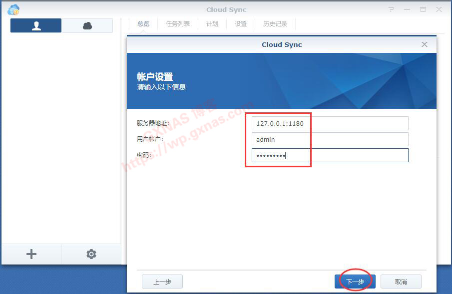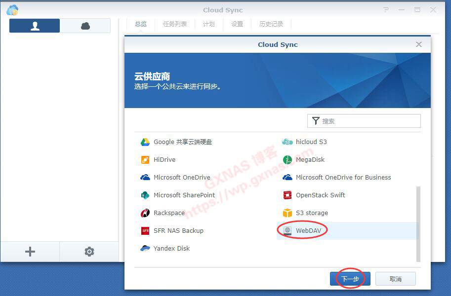 十八、回到群晖,打开Cloud Sync套件,选WebDAV下一步;