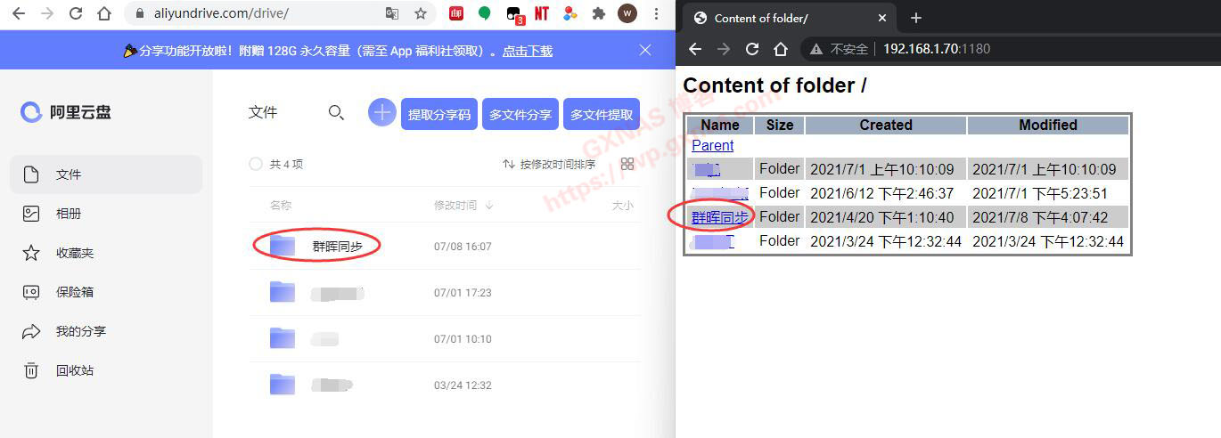 十七、就会看到阿里云盘的文件显示出来了:下图左边为阿里云盘的界面,右图为群晖容器运行显示的界面,可以看到两边内容是一样的,证明搭建成功;