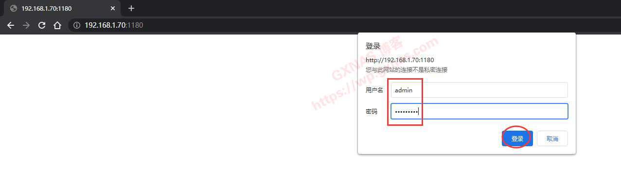 十六、在浏览器的地址栏,输入http://群晖的IP地址:1180 打开,输入用户名admin 和在上面第十一步设置的访问密码,登录;