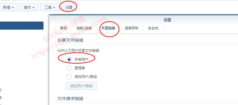 3、点菜单上的“设置”,在弹出的对话框中,点“共享链接”,找到“允许以下用户共享文件链接”,把它改成“所有用户”,确定。