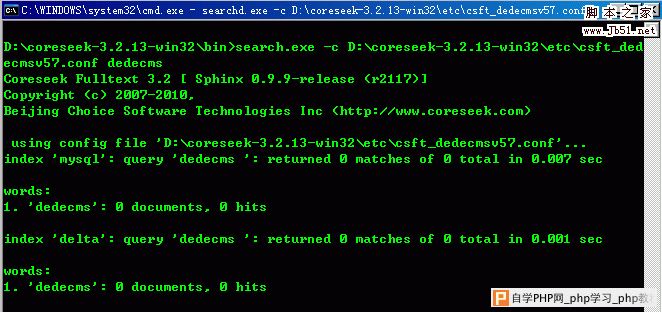 search.exe -c D:\coreseek-3.2.13-win32\etc\csft_dedecmsv57.conf dedecms