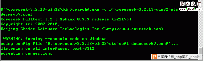 2.结合DedeCMS程序使用sphinx2.1.开启sphinx服务在上面的步骤中我们已经成功生成了索引,接下来为了能够使用客户端调用则需要开启sphinx服务.可以直接在cmd中执行:searchd.exe -c D:\coreseek-3.2.13-win32\etc\csft_dedecmsv57.conf这样我们就开启了sphinx服务(如图3),我们可以写一个简单的例子进行测试: