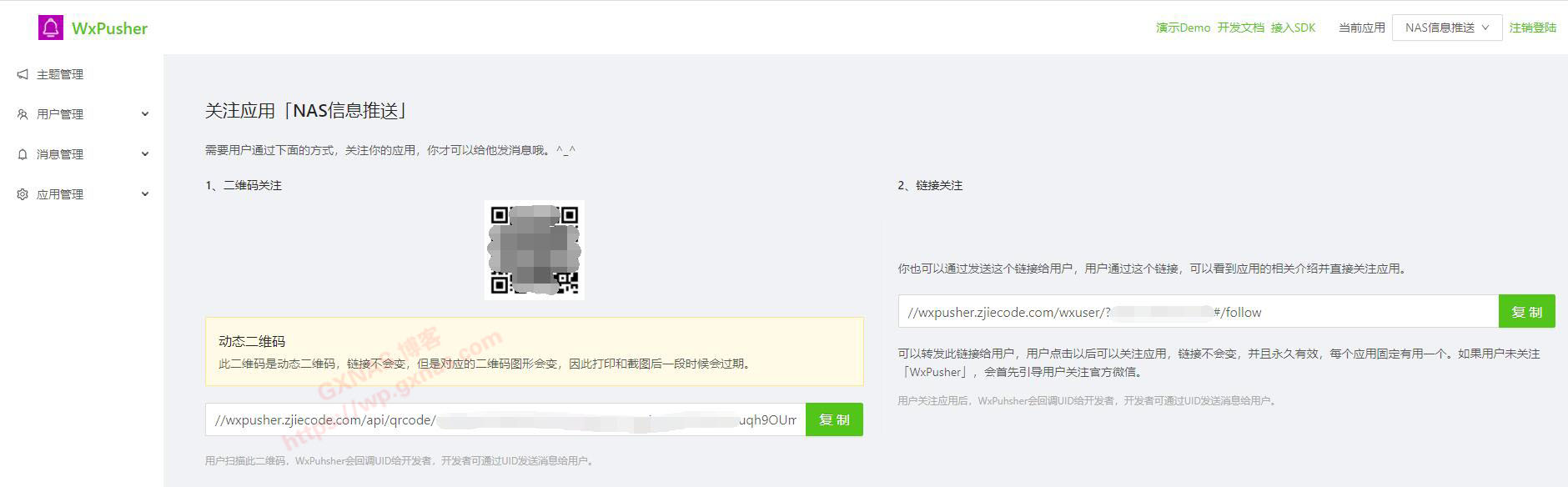 六、这里弹出一个二维码,用刚才第一步的微信扫一下这个二维码,就成功开启微信推送服务了;