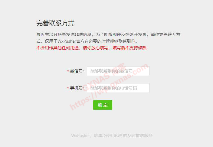 二、WxPusher会提示“完善联系方式”,输入微信号和手机号(这里不要求实名,可以随便写),确定;