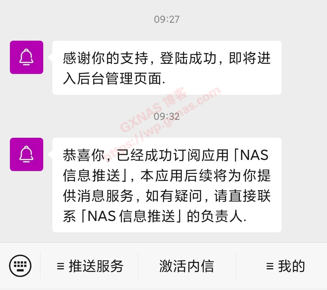 七、同时微信会收到下面这条信息,表示推送服务已经正式启用;