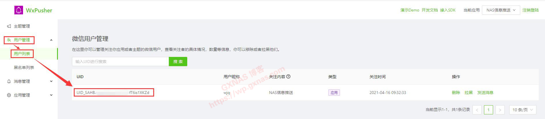 八、回到WxPusher-用户管理-用户列表,找到UID的值,记下来,一会要用到;