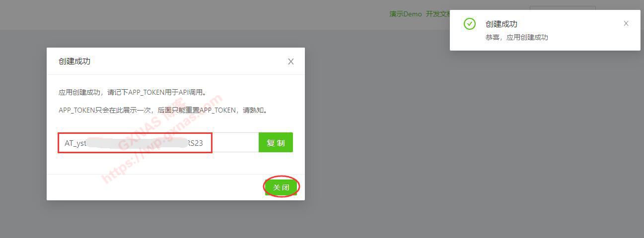 五、创建成功后,会显示一个APP_TOKEN,把这长串内容记下来并保存好,然后点;