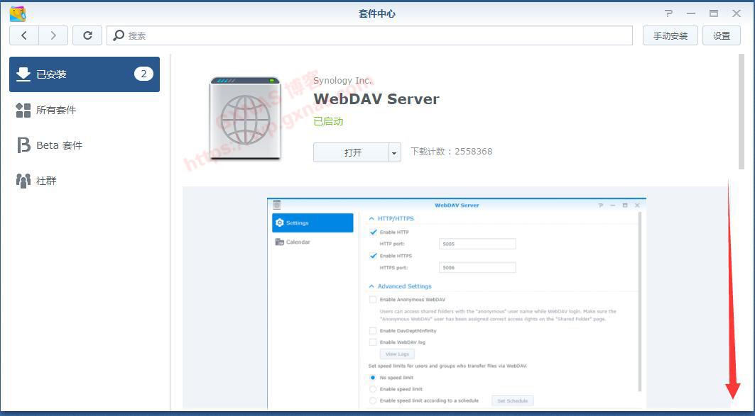 于是,我打开套件中心,点左边的“已安装”,在右边找到WEBDAV这个套件,点图标进去。