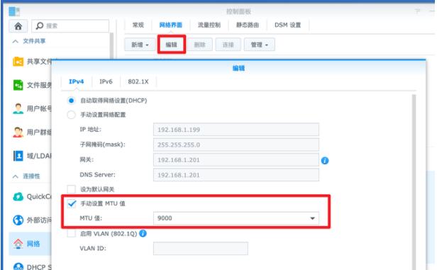 1、在群晖“控制面板”—“网络”—“网络界面”,选中你的2.5G或者10G网卡所在的“局域网 X” ,点“编辑”—“手动设置 MTU值” 改为 9000,确定。