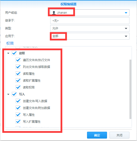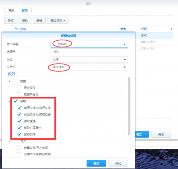 2、打开File Station,按照顺序,对于一二级目录:“共享文件夹“和”照骗”目录添加zhanan的访问权限。右键→属性→权限,分别加上zhanan的读取权限全选,且仅应用于当前目录,如下图: