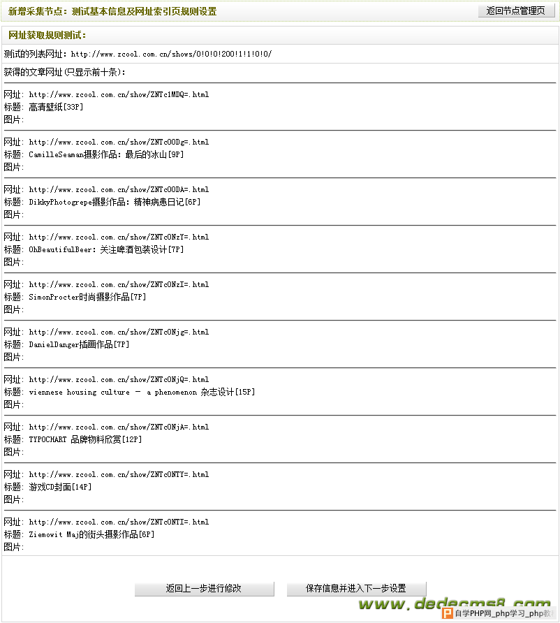 全部完成并检查无误后,单击“保存信息并进入下一步设置“。如果之前设置正确,单击后,将会进入“新增采集节点:测试基本信息及网址索引页规则设置的网址获取规则测试”页面并看到相应的文章列表地址。如(图20)所示,