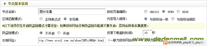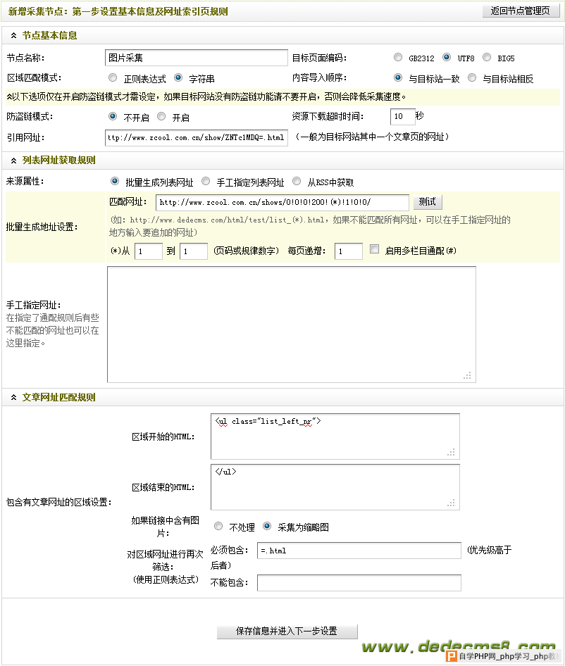 确定正确无误后,如果单击“仅保存”,系统将会提示“成功保存配置“并返回”采集节点管理“界面;如果单击“保存并开始采集“,将会进入”采集指定节点“界面。否则,请单击“返回上一步进行修改”。 本文是“Dedecms采集功能的使用方法 --- 图片集“的第三节,在前两节的基础上,将会对“如何采集指定节点”和“如何导出采集内容”做详细的介绍,并在最后给出本例的采集配置源码。为了与前文保持一致,本文将延续使用前文的章节标记。 本文的采集规则: {dede:listconfig} {dede:noteinfo notename="图片采集" channelid="2" macthtype="string" refurl="http://www.zcool.com.cn/show/ZNTc1MDT=.html" sourcelang="utf-8" cosort="asc" isref="no" exptime="10" usemore="0" /} {dede:listrule sourcetype="batch" rssurl="http://" regxurl="http://www.zcool.com.cn/shows/0!0!0!200!(*)!1!0!0/" startid="1" endid="1" addv="1" urlrule="area" musthas="=.html" nothas="" listpic="1" usemore="0"} {dede:addurls}{/dede:addurls} {dede:batchrule}{/dede:batchrule} {dede:regxrule}{/dede:regxrule} {dede:areastart}