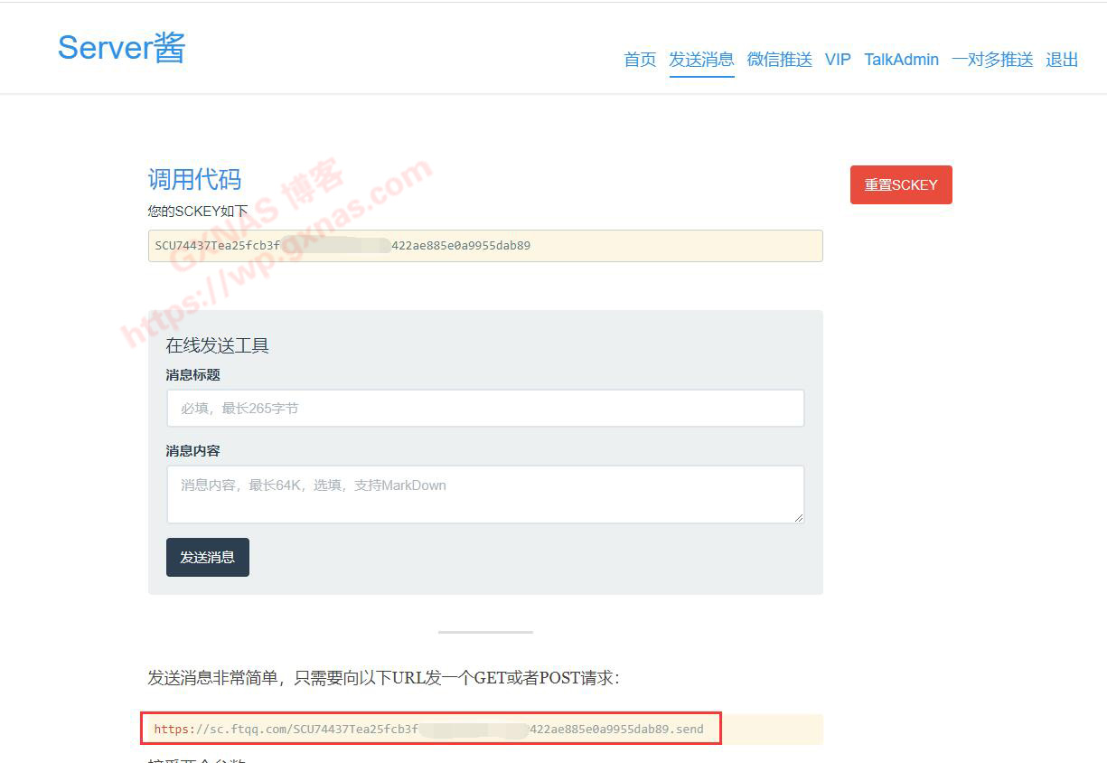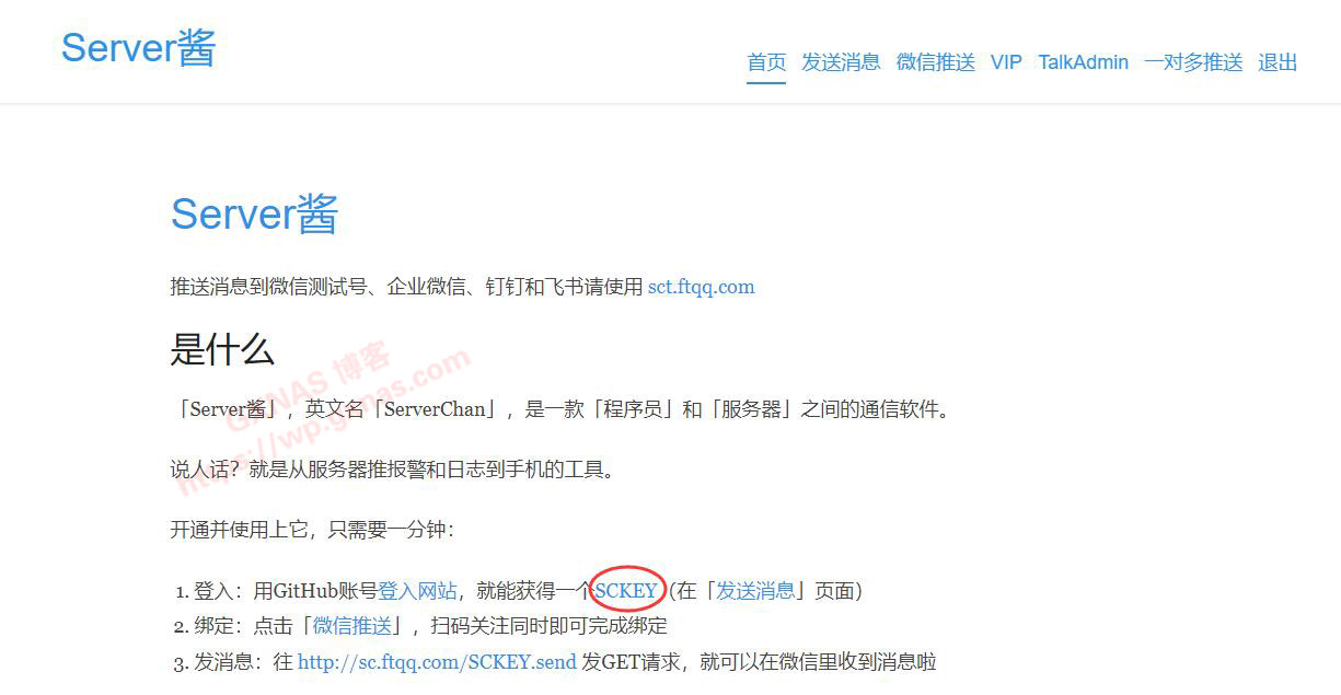 5、在弹出的界面中,获取到Server酱网站的一个SCKEY码,这个码相当于一个授权代码,才可以用微信推送信息,下面有个链接,这个链接复制一下,等下需要用到;