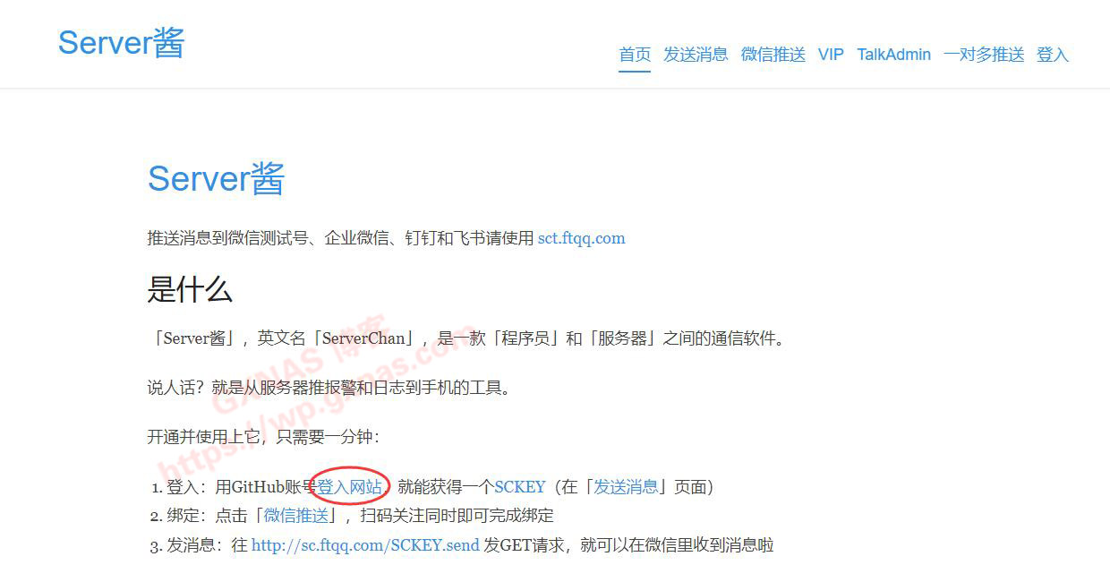 2、再打开这个提供微信推送服务的网站(地址:http://sc.ftqq.com/),点下图位置的“登录网站”;