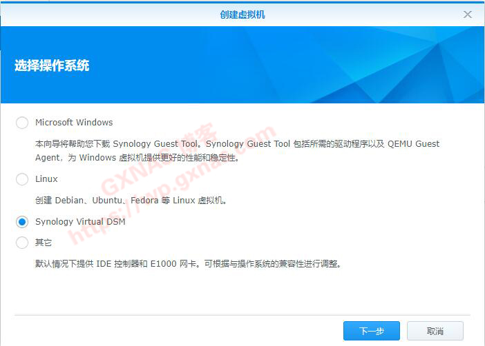 七、创建虚拟机,选择操作系统选“Synology Virtual DSM”,下一步;