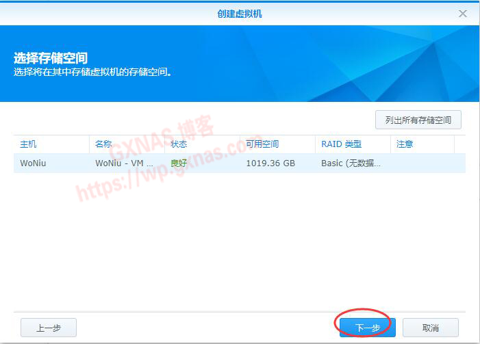 八、新增DSM映像,选择存储空间,选择你要保存的磁盘空间,我这只有一个硬盘,所以没得选择,就直接下一步;