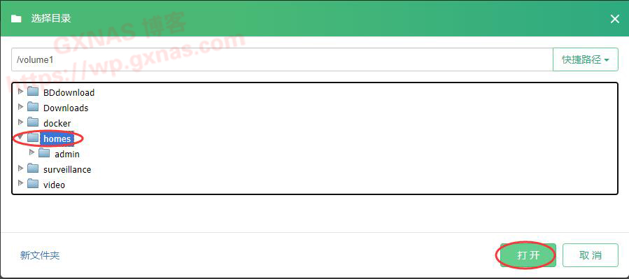 19、选择要把群晖的文件夹同步到电脑上的哪个文件夹,选好文件夹以后,点“打开”;